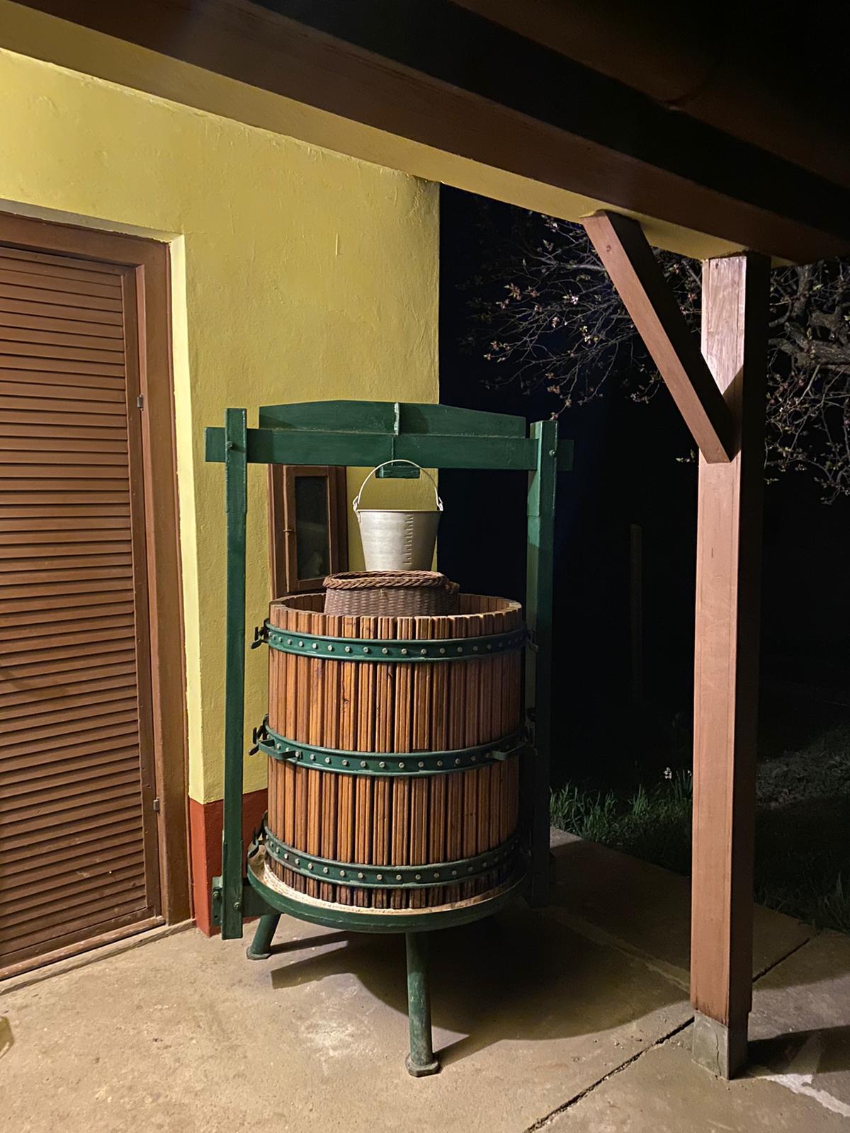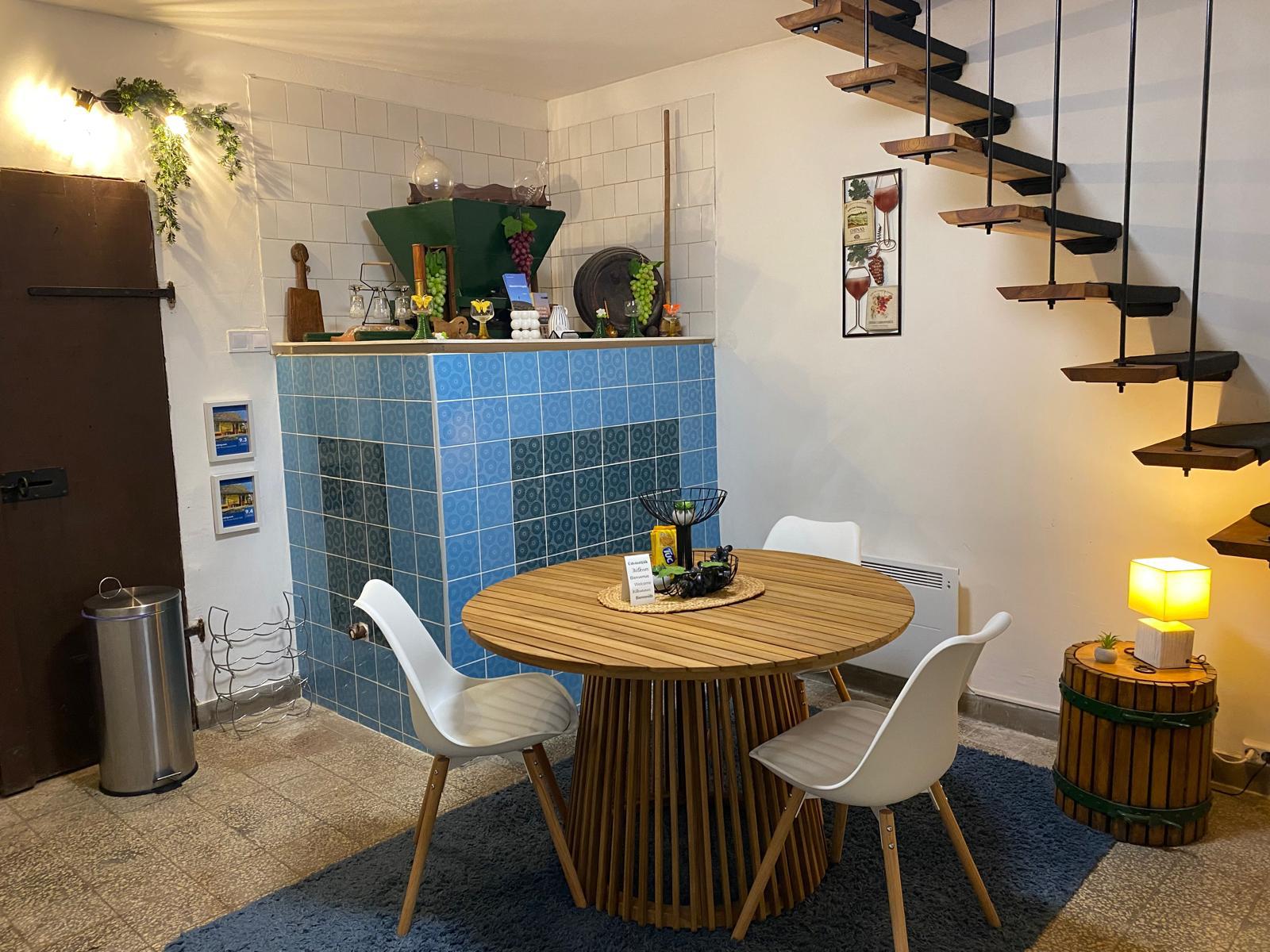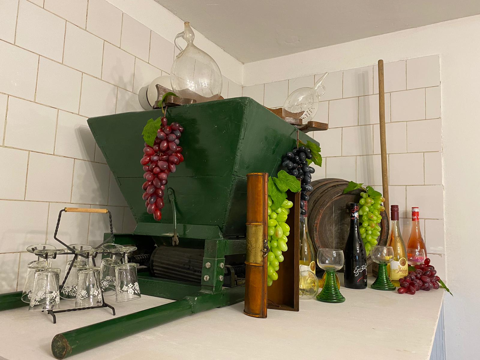 We houden de wijngaard in ere en hopen , net als afgelopen jaar, onze eigen wijn te hebben daarom is bij de renovatie alles orgineel gehouden want tijdens de oogst wordt alles nog gebruikt…van het persbad, wijnkelder en vaten toe! Men komt binnen in het pershuis met een inpandige wijnkelder waar we nu een gezellige ruime leefkeuken van hebben gemaakt. Het persbad voor de wijn hebben we behouden en betegeld met authentieke tegels. Vanuit de open keuken komt men in de huiskamer met slaapbank en vandaaruit in de geheel nieuw gerealiseerde badkamer met separaat toilet.