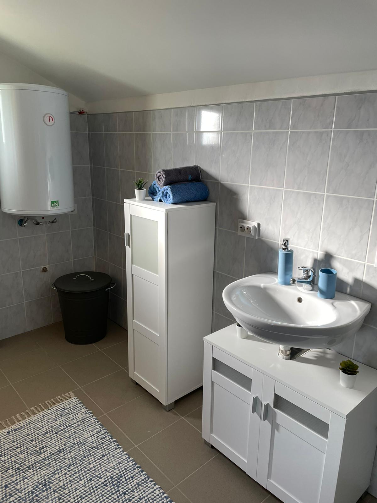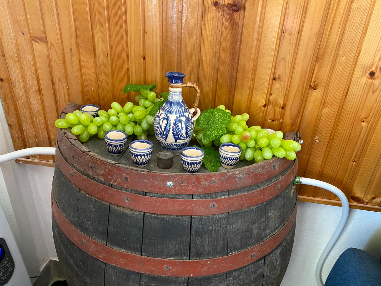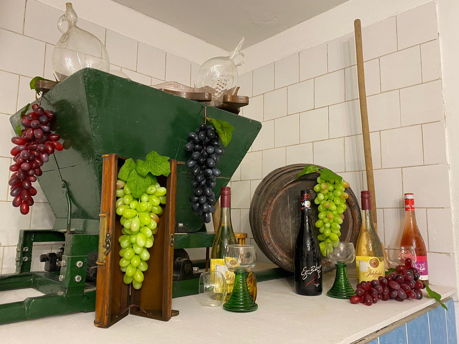 We houden de wijngaard in ere en hopen , net als afgelopen jaar, onze eigen wijn te hebben daarom is bij de renovatie alles orgineel gehouden want tijdens de oogst wordt alles nog gebruikt…van het persbad, wijnkelder en vaten toe! Men komt binnen in het pershuis met een inpandige wijnkelder waar we nu een gezellige ruime leefkeuken van hebben gemaakt. Het persbad voor de wijn hebben we behouden en betegeld met authentieke tegels. Vanuit de open keuken komt men in de huiskamer met slaapbank en vandaaruit in de geheel nieuw gerealiseerde badkamer met separaat toilet.