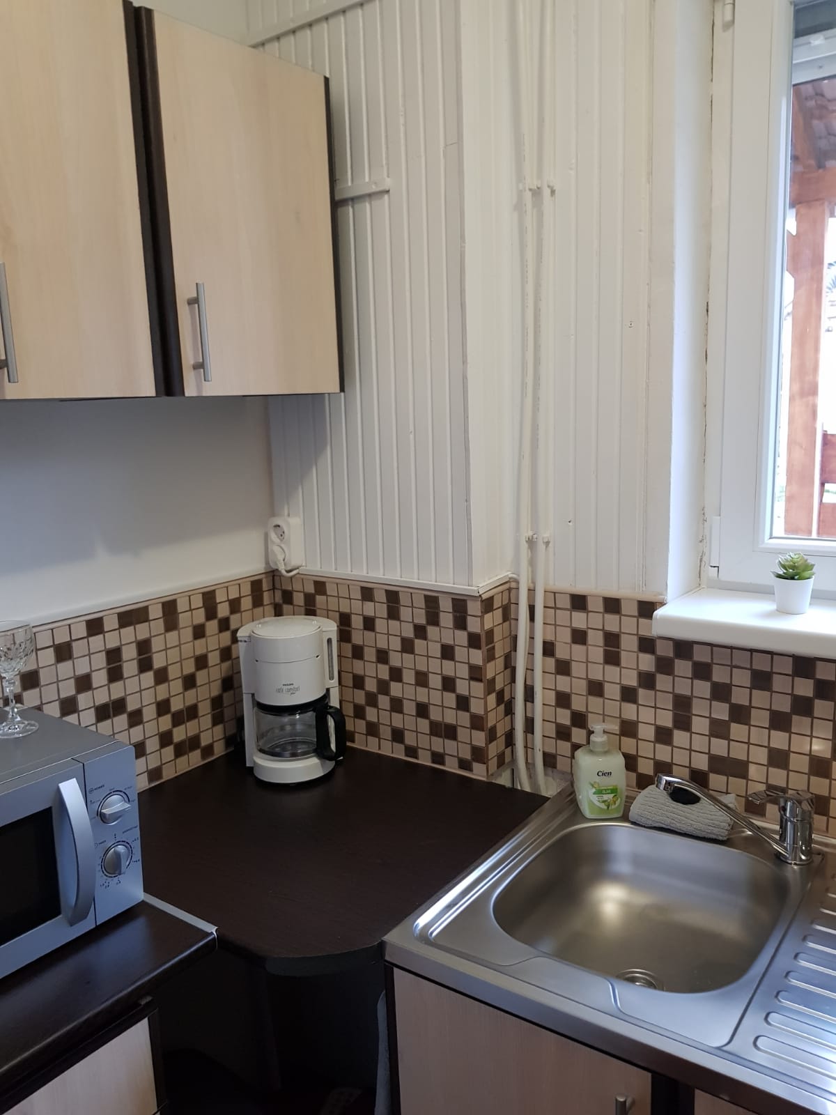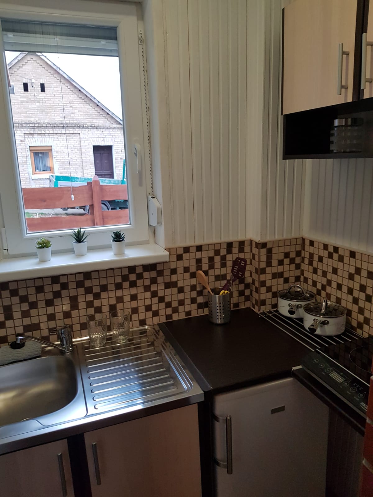 Ook voor de keuken geldt…klein maar fijn…maar alles wat men nodig heeft in een keuken is aanwezig. Koelkast,magnatron, koffiezetapparaat en waterkoker. Op de elektriche kookplaat kan makkelijk worden gekookt. Er is een compleet 4-persoons servies en bestek aanwezig. Vanuit de keuken heeft men een uitzicht op de kleine tuin. Heerlijk veel lichtinval.