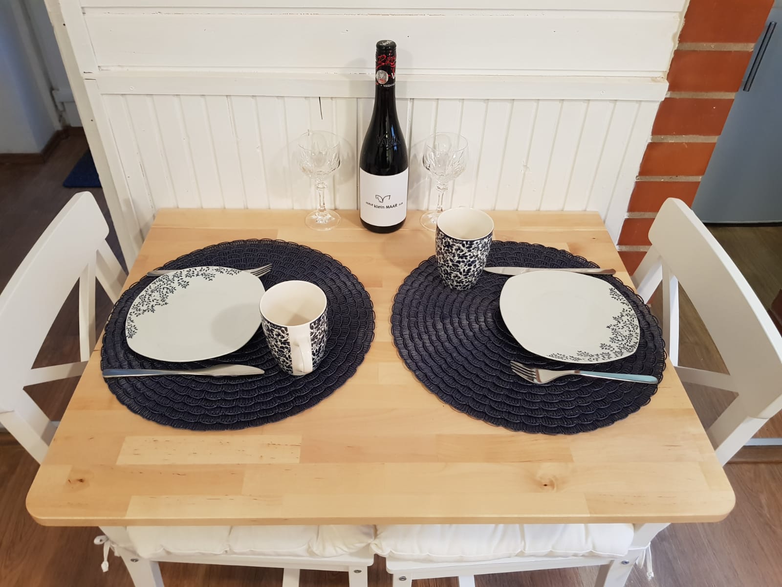 Aan het opklaptafeltje is het heerlijk zitten voor ontbijt en avond eten.