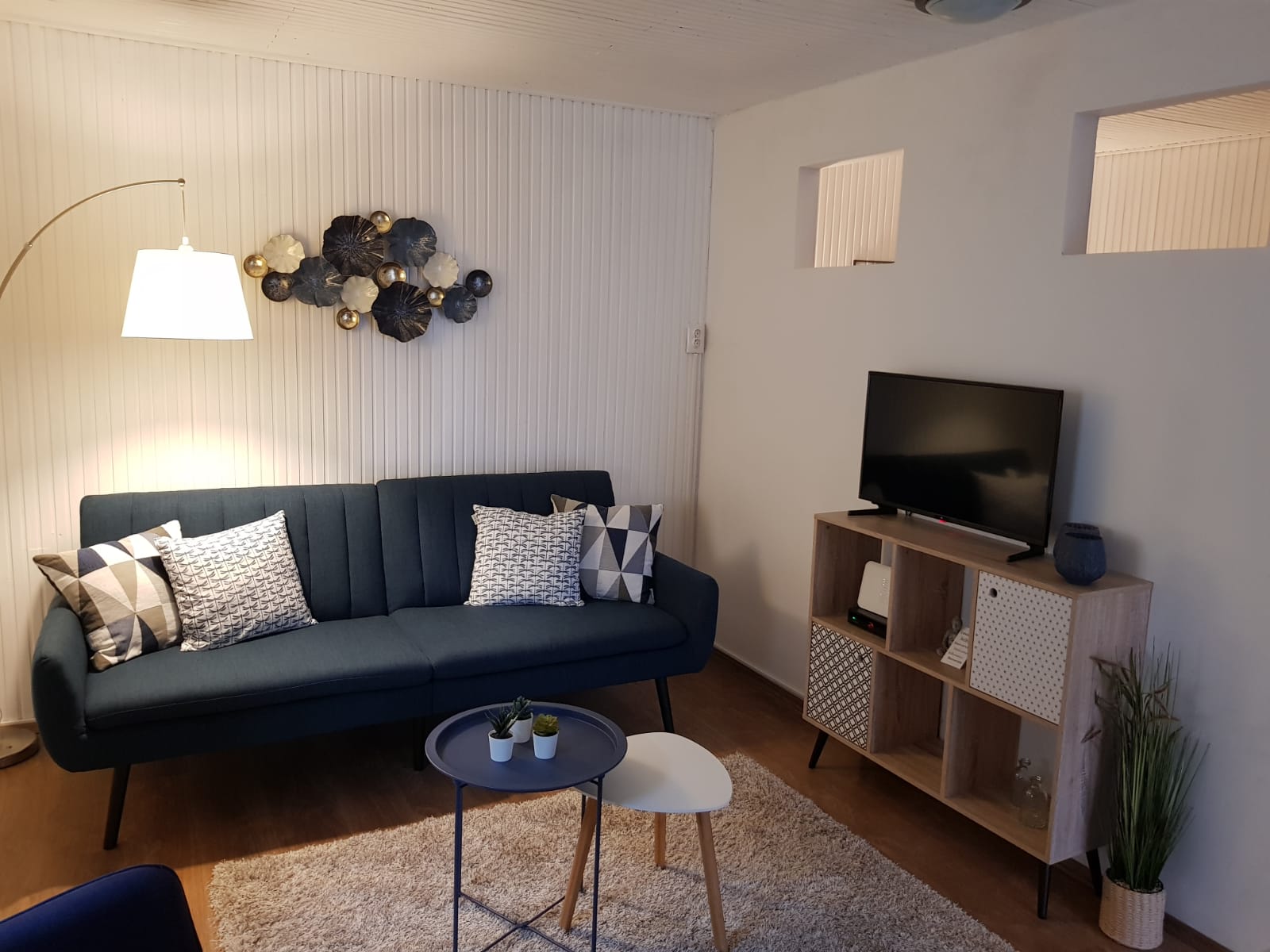 De woonkamer is heerlijk licht en gezellig ingericht met een leuk zitje, bank en stoel en zo nodig kan men de bank uitklappen tot een extra eenpersoonsbed. Er is internet ( glasvezel ) en een grote tv.
